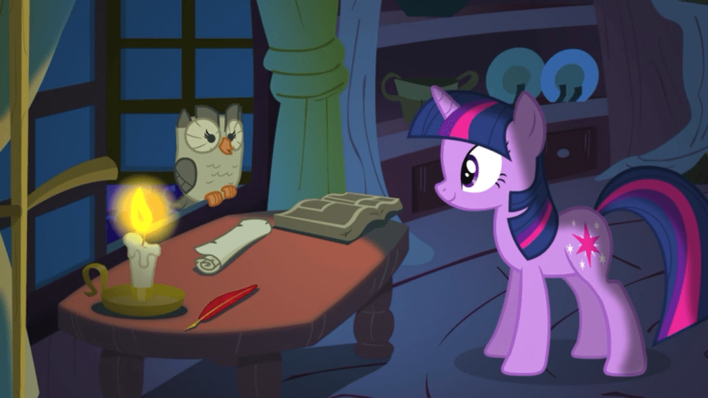 At night, Twilight Sparkle writes an essay about comets that reads a lot like a Wikipedia article and almost loses her scroll until an owl pops in and retrieves it. She allows the owl to keep her company, finally giving Twilight a pet like most of her friends already have.