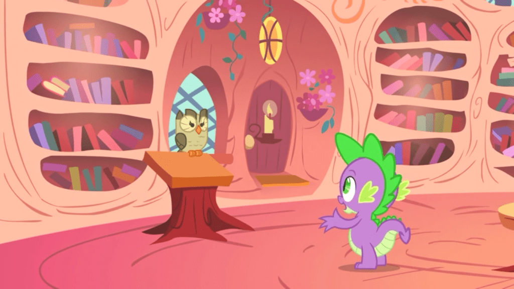 When Spike wakes up late the next morning, Twilight Sparkle assures him that Owlowiscious, her new junior assistant, has done all his chores for him. Spike immediately views the owl as a nemesis, which is a common pattern with him—he tends to have completely wrong ideas of when someone is antagonizing him and when he must step up and be a noble hero. In this case, he thinks Owlowiscious has rudely taken his place and brainwashed all his pony friends into directing the same praise they gave Spike at the owl instead. He comes to this conclusion after seeing all his friends outside praise the owl and goes back inside before he can hear them say he isn’t being replaced.