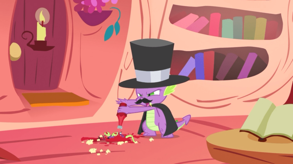 Spike is convinced that Owlowiscious, uh… secretly poked him and made him sneeze, causing the astronomy book to be destroyed? Well, really just that Owlowiscious was behind the book’s burning somehow. The way he jumps to this ridiculous conclusion and decides to take revenge clearly shows he isn’t thinking straight. He’s gotten carried away in self-image and probably thinks his framing will fool Twilight because the owl has “brainwashed” her. Because of this mindset, he thinks Twilight will fall for a torn-apart plush mouse covered in ketchup and surrounded by pillow feathers. I find it interesting that even though this show obviously can’t show any real blood, fake blood is totally OK. This allusion to blood effectively shows how carried away Spike has gotten in his vengeful scheme and is far too silly for any viewers to find terrifying.
