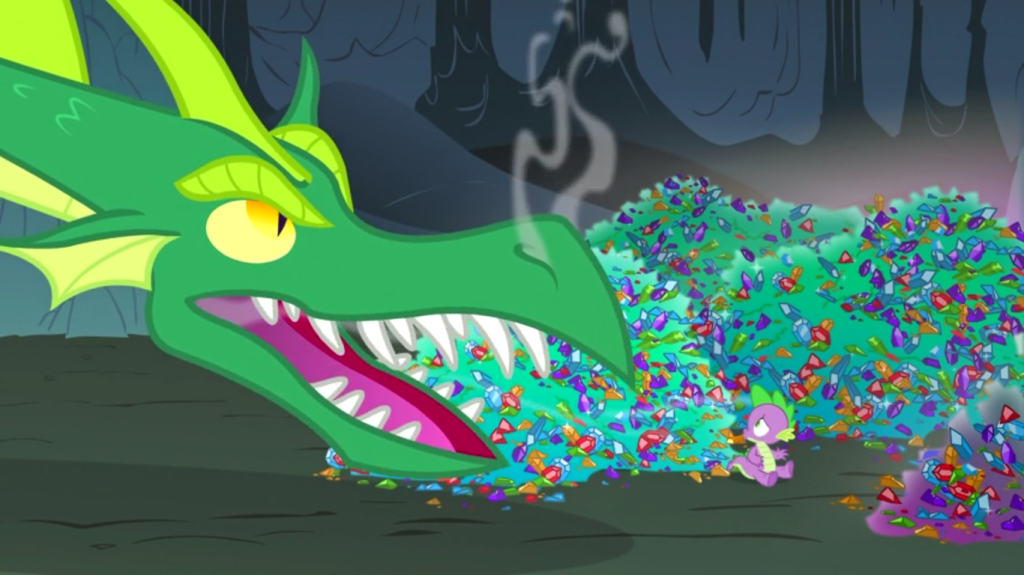 Spike settles in a cave filled with gems, which turns out to be occupied by a gigantic dragon. Owlowiscious comes in just in time to save the day, then leads him and Twilight Sparkle back home. Twilight seems to have forgotten she can use her horn as a light, perhaps because she’s in such a haste.