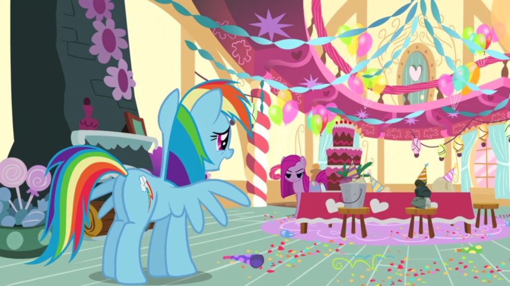 Much like how Rainbow Dash got Rarity out of her days-long meltdown in Suited for Success, here she’s faced with the task of getting Pinkie Pie, who her friends are no doubt very concerned about. It’s a fitting choice for Rainbow Dash to be the one who witnesses Pinkie Pie’s mental breakdown firsthand, because if Rainbow Dash of all ponies finds something scary, that’s how you know it’s downright terrifying. Fluttershy would have squeaked and then been all like, “oh goodness, this is, erm… interesting. Not what I expected exactly, but I’m sure there’s a good reason for you to be playing with all these… inanimate objects? Oh, and I, uh… really like your new hairstyle, it’s… nice. I’ll just… get going now, if that’s OK with you.” And Pinkie Pie would have been stuck playing with rocks and turnip buckets forever.