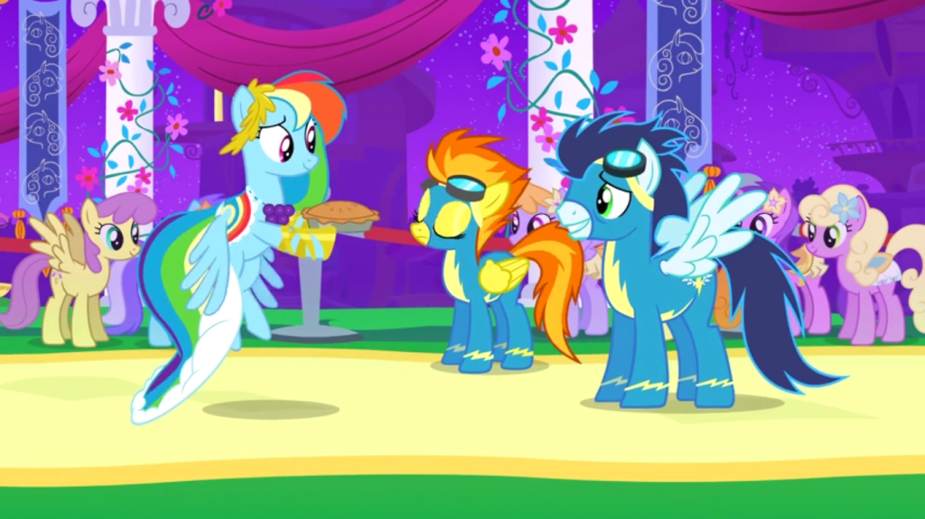 Rainbow Dash swoops into the VIP booth just in time to save Soarin’s apple pie and is invited to hang out with the Wonderbolts, seemingly as a reward. Saving a pie is a very minor feat compared to what Rainbow Dash did in the episode Sonic Rainboom, and it’s not quite the intrusion into the Wonderbolts’ flight show that she expected to do, but she’s extremely excited to hang out with the Wonderbolts anyway. This suggests that the ponies’ fantasies will only go slightly worse than they expected, but they’re very wrong.