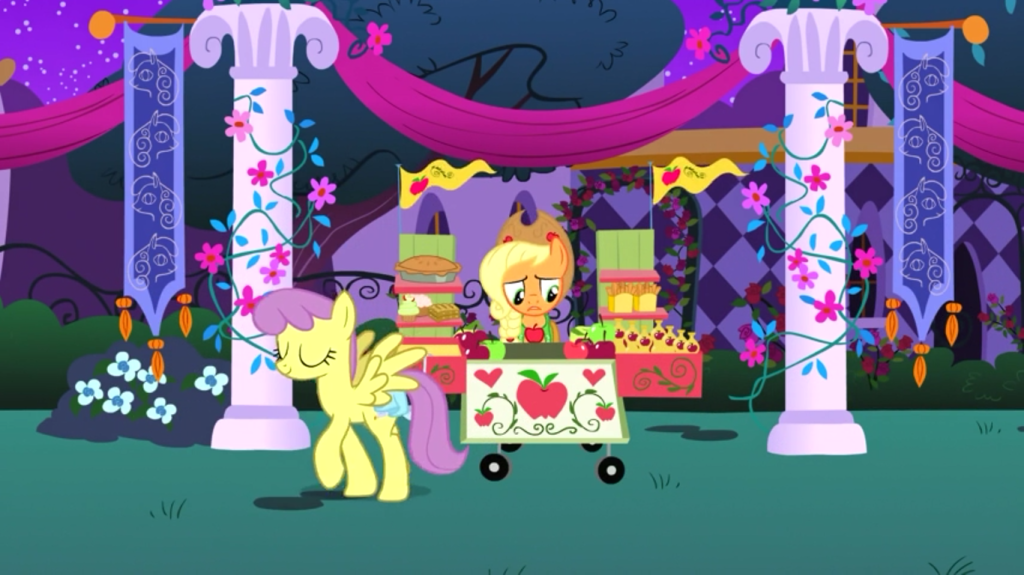Everyone remembers Fluttershy’s mental breakdown in this episode, but no one talks about how Applejack also loses her cool and takes foolishly desperate measures to get guests’ attention. She knocks some apples over and makes a guest trip on them, hoping that will make him notice the stand and want to buy her apple products. The stand already got no attention, but getting deliberately tripped by the stand’s owner just makes you think the owner is a total buffoon. And who would want to buy food from a total buffoon?