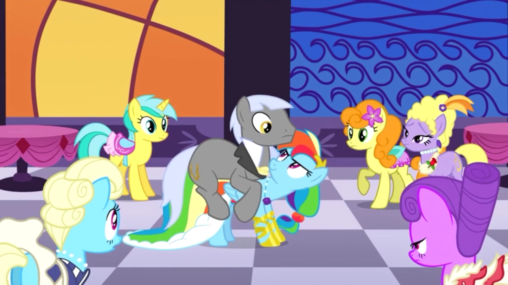 Rainbow Dash gets lost in a crowd and struggles to be heard when trying to start conversation with the Wonderbolts. Even the viewer can’t quite make out what she’s saying due to all the chatter, which perfectly shows how overwhelmed Rainbow Dash is in this gigantic crowd. She clearly isn’t used to such boisterous crowds, much unlike the Wonderbolts who regularly attend the gala and know how to keep their cool in crowds.