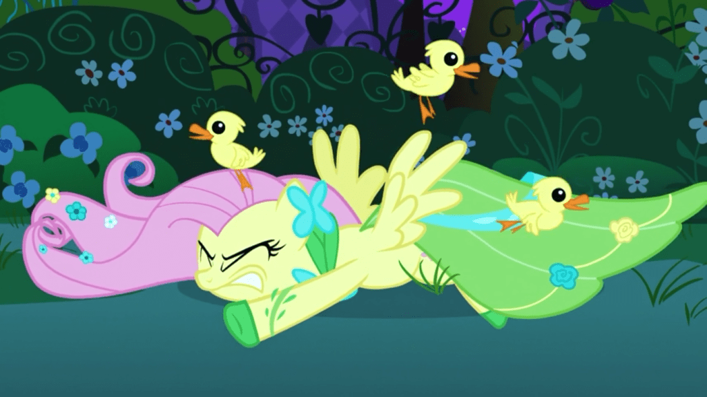 Hilarity ensues when Fluttershy starts setting up traps for the animals. I can’t decide what’s funnier: Prince Blueblood doing everything backwards or Fluttershy’s desperate attempts to catch animals. Probably Fluttershy’s desperate attempts, because that’s so absurdly unlike her!!! She’s just so used to animals being kind and open to her that she throws away her usual sweet and soft-spoken personality when animals aren’t like that. She very poorly tries to sound as sweet as she usually does when talking to the animals, then sets off the trap when she hears the carrot being munched, only for it to turn out to be the same gardening pony whose whistling she mistook for a bird, much to her annoyance. Even her traps aren’t working out! Probably because Fluttershy would normally never even think of resorting to traps.