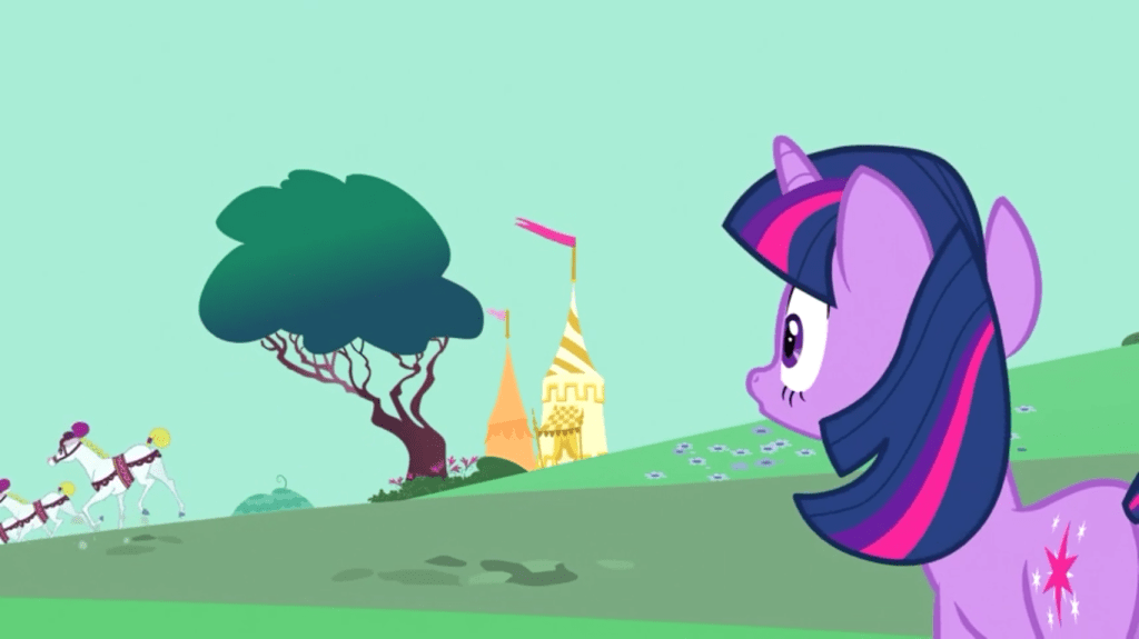 Although Twilight Sparkle typically doesn’t think of herself as important, her fantasy here is extremely self-important. She just assumes she will get to spend time with the ruler of Equestria and no one else, just because she’s a longtime student of Celestia’s. She doesn’t stop to consider what other obligations Celestia might have. All the Mane 6’s fantasies are incredibly self-absorbed; only Spike thought to account for the interests of others in his fantasy, when he suggested during the carriage ride to take his friends to specific places in Canterlot that he thinks they will like.
