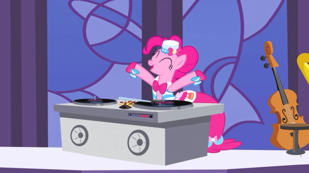 And finally, Pinkie Pie exploring the gala brings us the debut of fan favorite musician pony Octavia Melody, who eventually gets a few more background appearances until she becomes voiced in season 5. Octavia’s bandmates aren’t as lucky though. If you don’t mind me diverting into music talk for a moment, I can’t decide if Octavia’s instrument is a cello or a double bass (which is NOT the same thing as a cello). The position of the tuning pegs and size relative to the player suggest it’s a double bass, but the instrument’s shape and tone of the music suggest it’s a cello. It’s also weird that Octavia’s cutie mark is a treble clef when cellos use the bass clef—did she have a stint playing violin before she switched to cello? I’m asking REAL questions here.