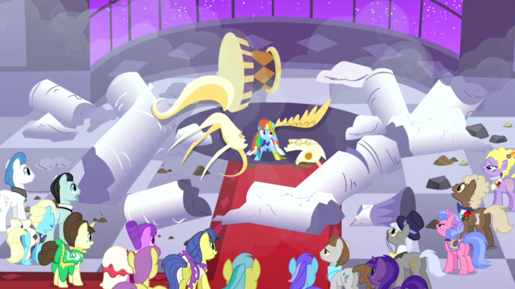 And the chain reaction continues from here. Prince Blueblood falls backwards and nearly topples the pony statue in the center, until Rainbow Dash’s hubris gets the best of her and she tries to save the statue from falling only to clumsily handle it and cause all the pillars to collapse like dominoes. She’s forgotten that physical prowess isn’t her strong suit, which shows how carried away she’s gotten with trying to do something awesome.