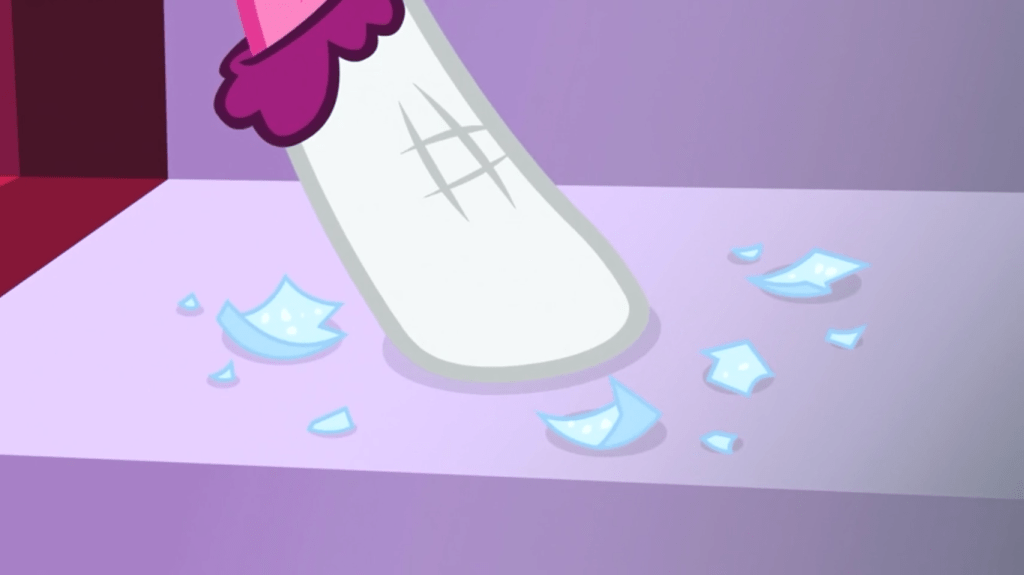 How’s THAT for a subverted Cinderella reference??? Rarity loses her glass slipper, but instead of it remaining as a sign for the prince to find her, the eternally oblivious Pinkie Pie points it out, leading Rarity to break the slipper so she never has to see that awful prince again. This right here is the best possible way to reference a Disney princess movie. Instead of playing along with the reference, you put a new twist on it or subvert it entirely. The fact that a pony so high-strung about fashion would willingly destroy her own glass slipper shows how aggravated she is with Prince Blueblood.