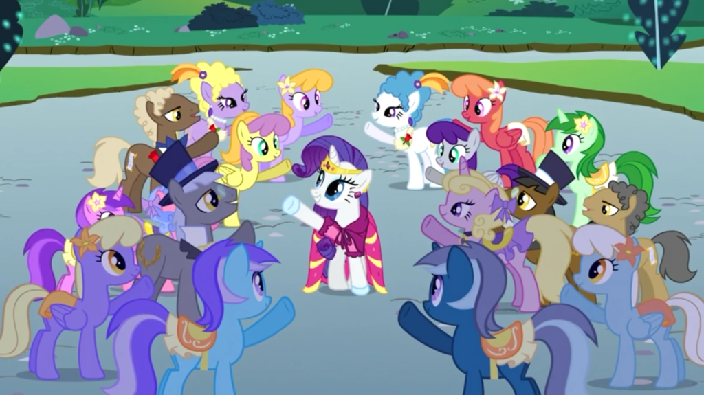 The background ponies at the gala aren’t your usual background ponies. They’re all dressed and stylized fancy for the occasion, and most of them are clearly Canterlot residents.