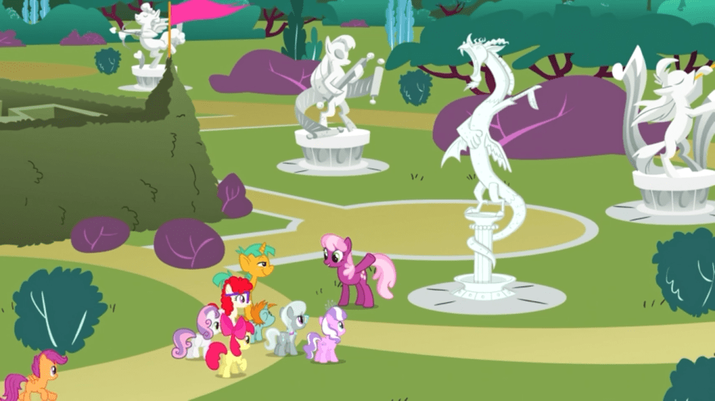 The very beginning of season 2 of My Little Pony: Friendship Is Magic demonstrates that the show’s cast has solidified quite a bit over its first season. Cheerilee is taking the Cutie Mark Crusaders’ class on a field trip to the Canterlot sculpture garden, and the class now has a good eight members who are actual characters and not just generic extras: an inseparable trio, two inseparable duos, and Twist. As the show’s cast of named characters expands, so does the show’s attention to detail, and you know how much I love some good attention to detail.