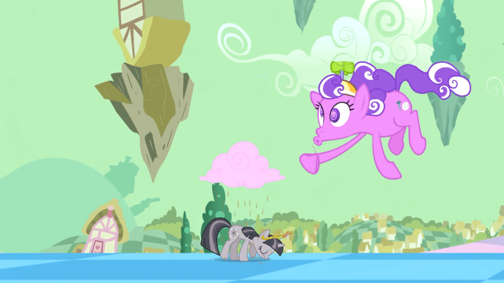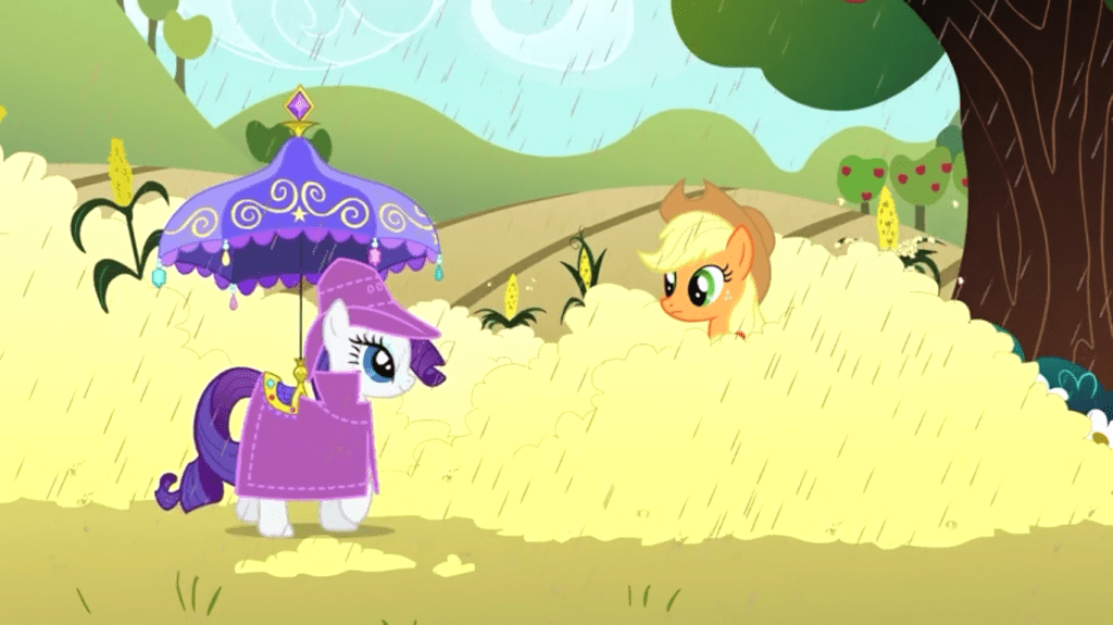 Rarity then enters the scene sporting a hilariously fancy umbrella. I can’t explain why, but something about this one specific umbrella is downright side-splitting to me.