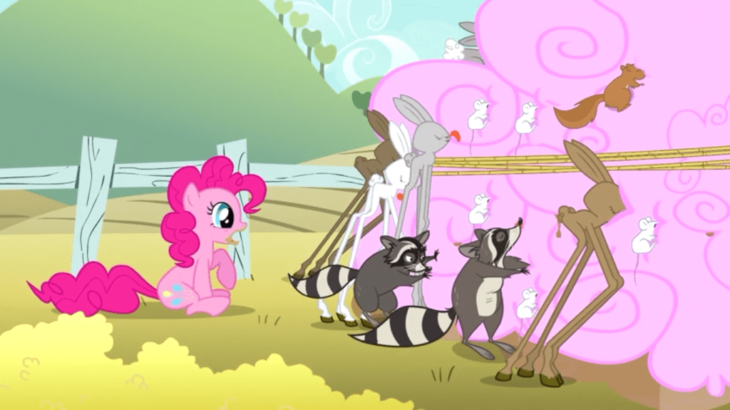 (animals come in and eat the cotton candy, knocking Pinkie aside)