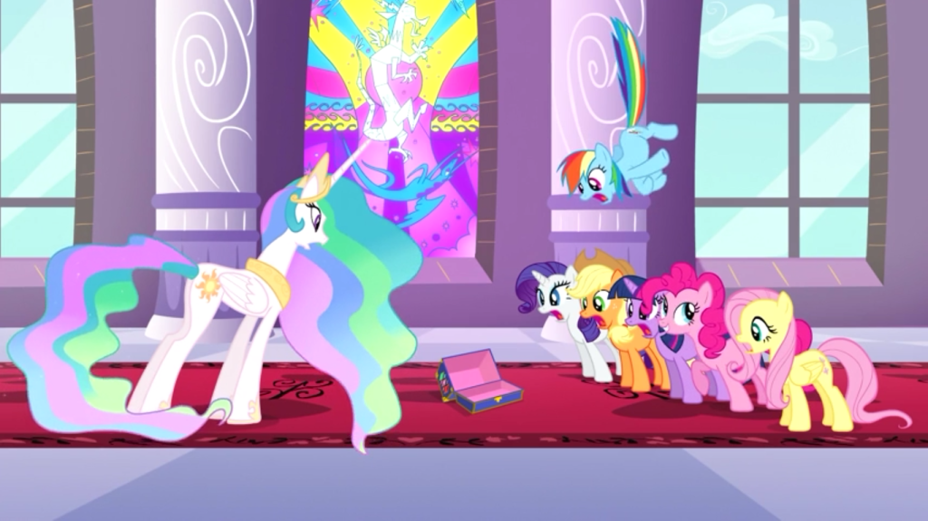 Celestia retrieves the safeguarded Elements of Harmony, but it turns out the elements have disappeared, which is a clever demonstration of how much of an omnipotent reality warper Discord is.