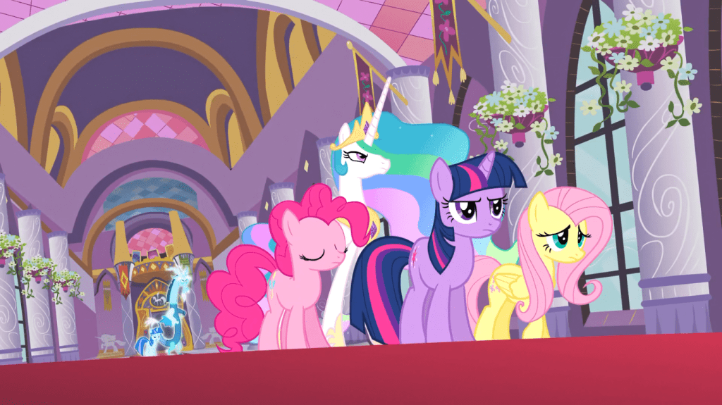 The episode ends with a ceremony honoring the Mane 6 for defeating Discord, where Celestia gives a speech and unveils a stained glass portrait showing Discord’s second defeat. There isn’t much to say about the ceremony—no interesting details or notable characters in the audience, but I guess the show’s cast wasn’t that expansive yet. Still, this is a worthy celebration of the ponies’ accomplishments, the second grandiose villain defeat of many more to come. The end of this episode features a zoom out on the Mane 6 smiling in front of the camera, although Fluttershy looks nervous at first and takes a moment to break into a still nervous smile.