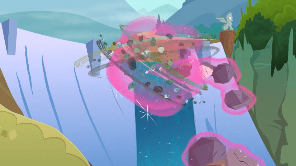 Rainbow Dash notices a dam with cracks in it and decides she can easily prevent it from breaking by covering the cracks with her hoof. Does she think that she’s just going to stand there forever and hold the dam shut? I guess this scene shows that she’s starting not to think straight and is increasingly desperate to do something heroic and earn attention, but it’s still incredibly weird. She did the same sort of thing in The Best Night Ever and it felt much more natural and fluid, but then again, her clumsy attempts at heroism were overshadowed by all the other crazy things that happened in the episode.