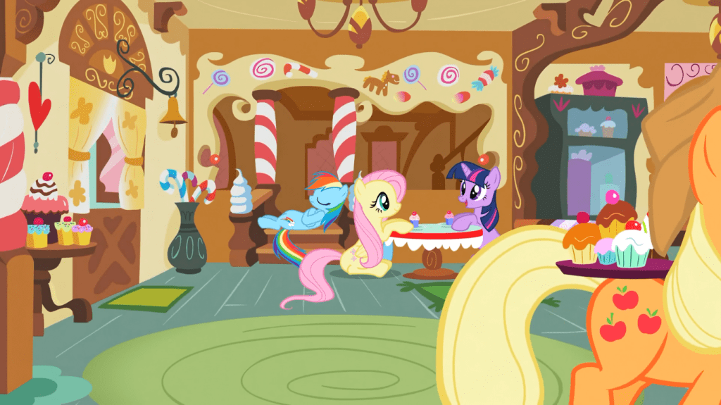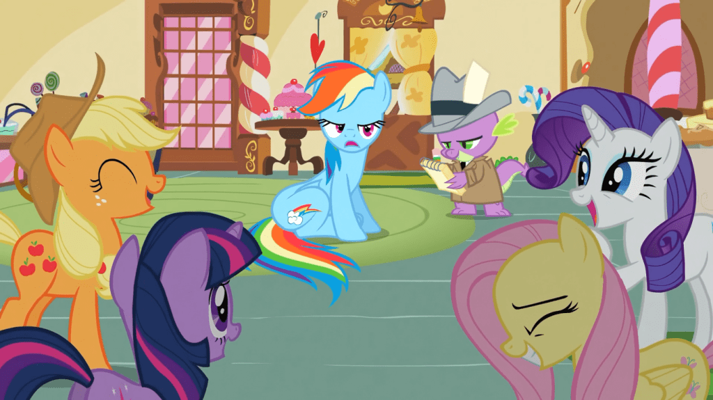 The members of the Mane 6 behind Mare Do Well (save for Pinkie Pie) hang out at Sugarcube Corner, praising Mare Do Well’s heroic feats and modesty. You may guess that the ponies are praising each other’s work—perhaps Fluttershy praises Twilight Sparkle’s magic spell, and Rarity compliments Applejack’s rescuing the carriage with her two hind hooves, right? WRONG! The ponies instead all praise either their own work as Mare Do Well or the hero’s general personality that they crafted together. Twilight Sparkle brags about the magic spell, which required a lot of studying, while Rarity praises Mare Do Well’s outfit. If we are to assume that Rainbow Dash has a hunch that her friends are behind Mare Do Well, then I can’t blame her one bit for being so aggravated. It would have made SO MUCH MORE SENSE if the ponies praised each other’s work. That could have done wonders for this episode’s moral! But instead, this scene makes the Mane 6 obnoxious if you know the twist.