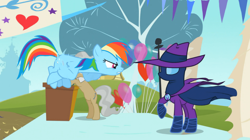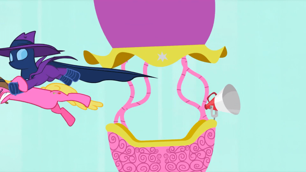 And here’s where the Mysterious Mare Do Well (so named by Mayor Mare) comes in. Rainbow Dash swoops in and tries to save a mare from a deflating hot air balloon, but Mare Do Well beats her to the punch, which irritates her. Rainbow Dash abruptly switches priorities from rescuing ponies from life-threatening danger to being the only hero in Ponyville, and things just get weirder from here.