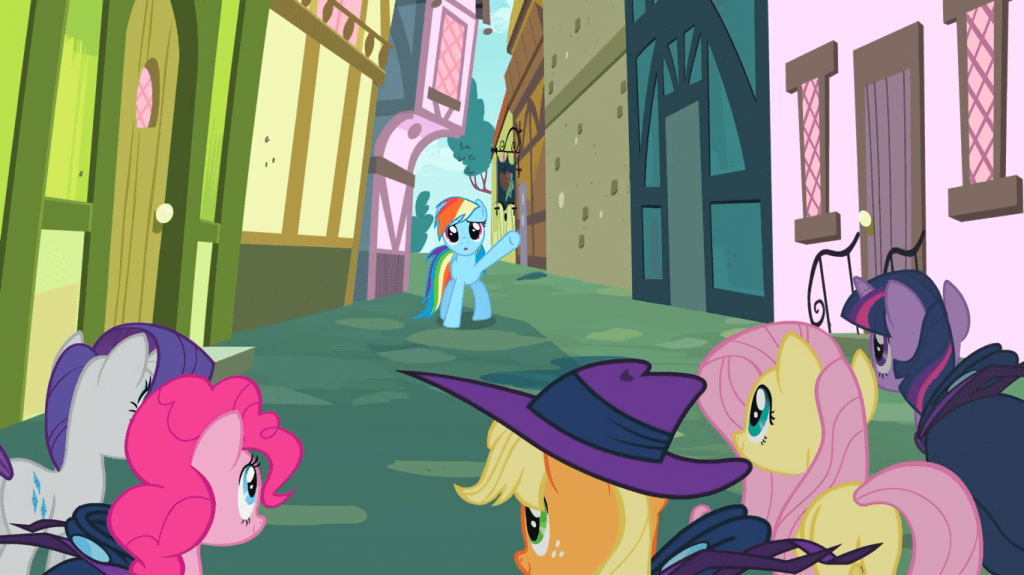 Rainbow Dash doesn’t know it, but when she says “she’s gonna learn that the hard way”, she’s referring to herself. She’s soon to learn (or at least probably learn?) that humility is an important facet of heroism, and it’s weird that we get such a meaningful foreshadowing line after an abrupt and forced decrease in Rainbow Dash’s power.