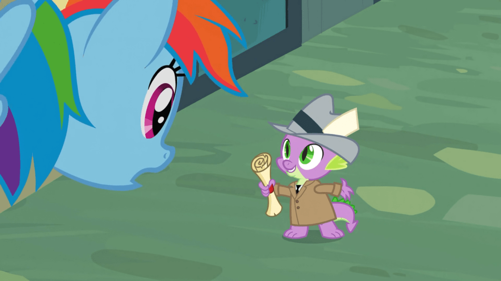 Rainbow Dash then reveals that she secretly listens in on every meeting of her fan club and sometimes anonymously interjects, which is very much in line with her exuberant self-image. Self-image is a trait that she has in common with Spike (the so-called “new Rainbow Dash”); I’ll compare the two at the start of Secret of My Excess, the first episode that my next post will cover.