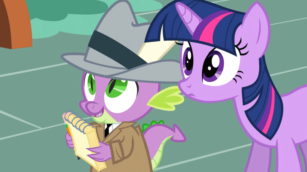 Rainbow Dash has hired Spike as a news reporter of sorts, or really more like a biographer. While Spike is enthusiastically supporting her role as a hero, every single other member of the Mane 6 unanimously agrees that she’s being extremely arrogant. This sharp division between the Mane 6 and the background ponies’ opinion on Rainbow Dash feels rather awkward and forced.