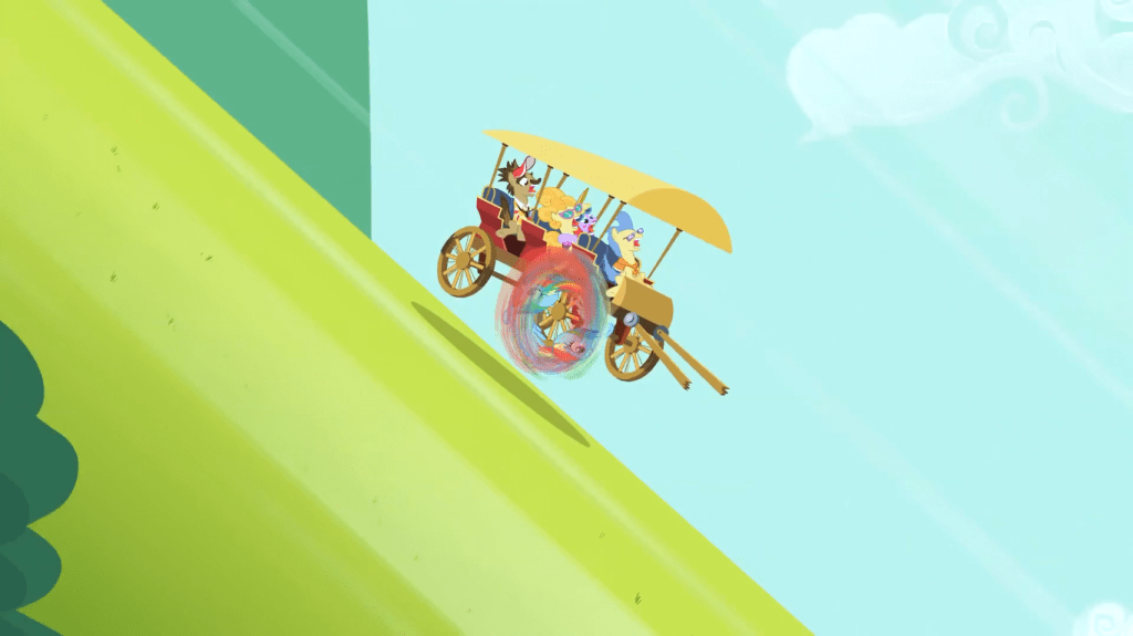 Similarly abrupt is Rainbow Dash’s decrease in competence at heroic rescues. She fails to stop a carriage from rolling down a hill while she had previously done quite a few feats requiring significant strength, but then Mare Do Well (actually Applejack in this scene) stops it successfully and saves the riders. It’s weird that only in the second third of this episode does the show remember that Rainbow Dash’s specialty isn’t physical strength. After all this weirdness, Rainbow Dash drops a surprisingly multilayered line: