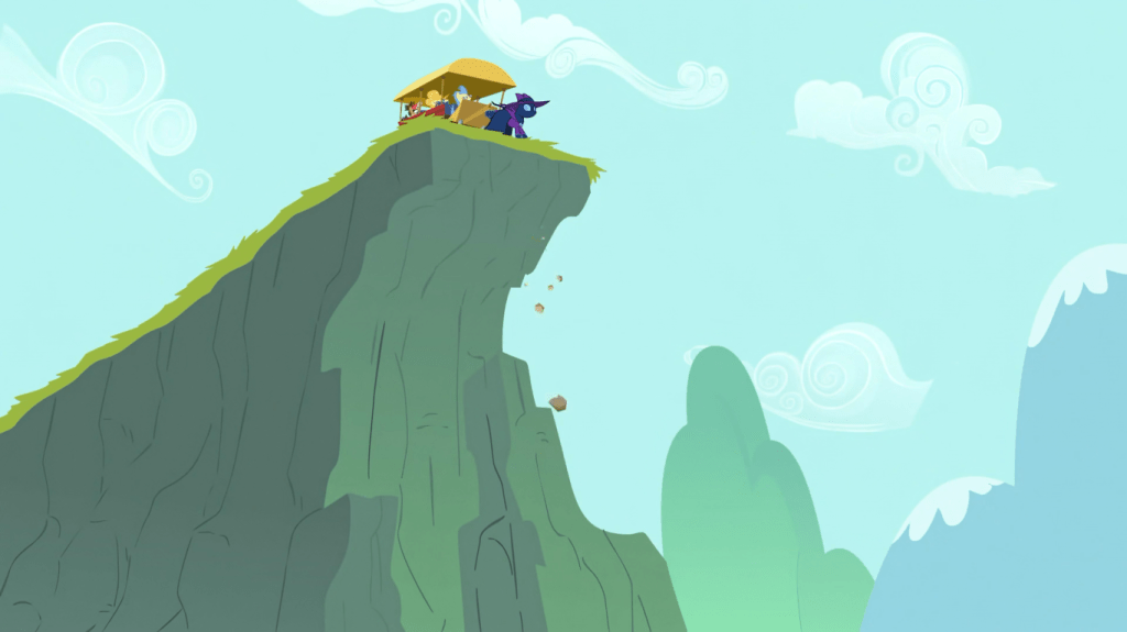 After the theme song, Rainbow Dash rescues various ponies young and old from life-threatening events like getting stuck in a well, almost rolling off a cliff in a stroller, and a balcony full of elderly ponies collapsing. The citizens of Ponyville eagerly cheer her on, which is more than warranted considering she’s saving other ponies’ lives, but the rest of the Mane 6 seem to pay far more attention to her arrogance. This is actually one of the times Rainbow Dash is at her least embarrassing, and yet her friends won’t give her a break.