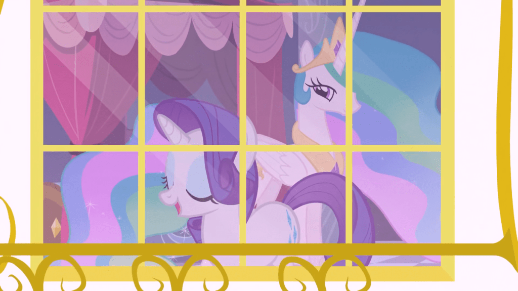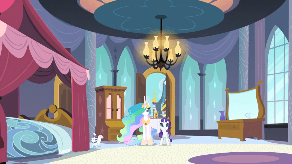 This episode starts with Rarity entering the room where she will be staying in Canterlot, a city that for her may as well be heaven. Rarity is extremely thankful to Celestia for helping accommodate her upon Twilight Sparkle’s request, to the point where she even kisses Celestia’s hooves. Twilight Sparkle having asked Celestia to do this is a good example of her doing favors for her friends, which shows that she’s been taking all her friendship lessons to heart and qualifies as character development.