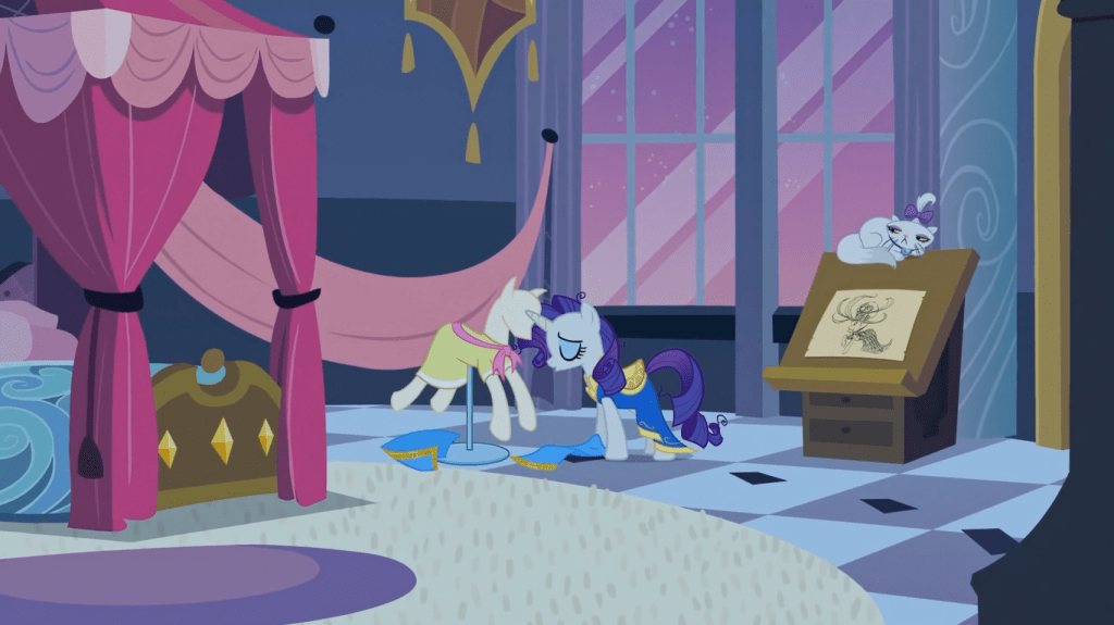 In typical Rarity episode fashion, Rarity starts by monologuing to her cat at a fancy restaurant about how perfect and wonderful Canterlot is, and then the worldbuilding kicks in with plenty of new characters who aren’t random background ponies. Rarity meets the haughty upper-class couple Jet Set and Upper Crust, and the clumsy house worker Hayseed Turnip Truck. Rarity’s episodes have quite a large swath of recurring characters, many of whom we meet in this episode; there’s also Hoity Toity, who we met back in season 1. It doesn’t take long for tears (not of joy) to well up in Rarity’s eyes, after those ponies claim she looks a little country-like and say that makes sense considering she’s from Ponyville. She resolves to change this reputation by designing a fancy new outfit for Twilight Sparkle’s upcoming birthday in her castle suite, even putting on her signature glasses in the process.