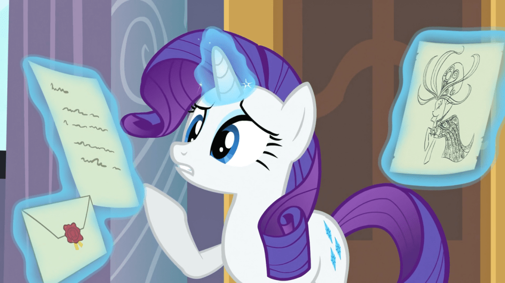 Right when Rarity is ready to leave her suite and return to Ponyville, she gets a letter from Jet Set and Upper Crust asking to attend the high-scale Canterlot garden party tomorrow, the same day as Twilight Sparkle’s birthday. After some deliberation, she chooses the garden party and writes a letter to Twilight, claiming that she has to stay longer her cat is not feeling well. She gets extremely theatrical when she narrates the portion of the letter where she claims Opal is ill, as if she knows what she’s doing is wrong but doesn’t want to confront the truth that she’s been avoiding preparation for her dear friend’s birthday, and then she goes back to her normal tone when she writes the letter’s closing. She isn’t avoiding the party preparation because she hates her Ponyville friends now, but simply because she’s been so distracted in Canterlot.