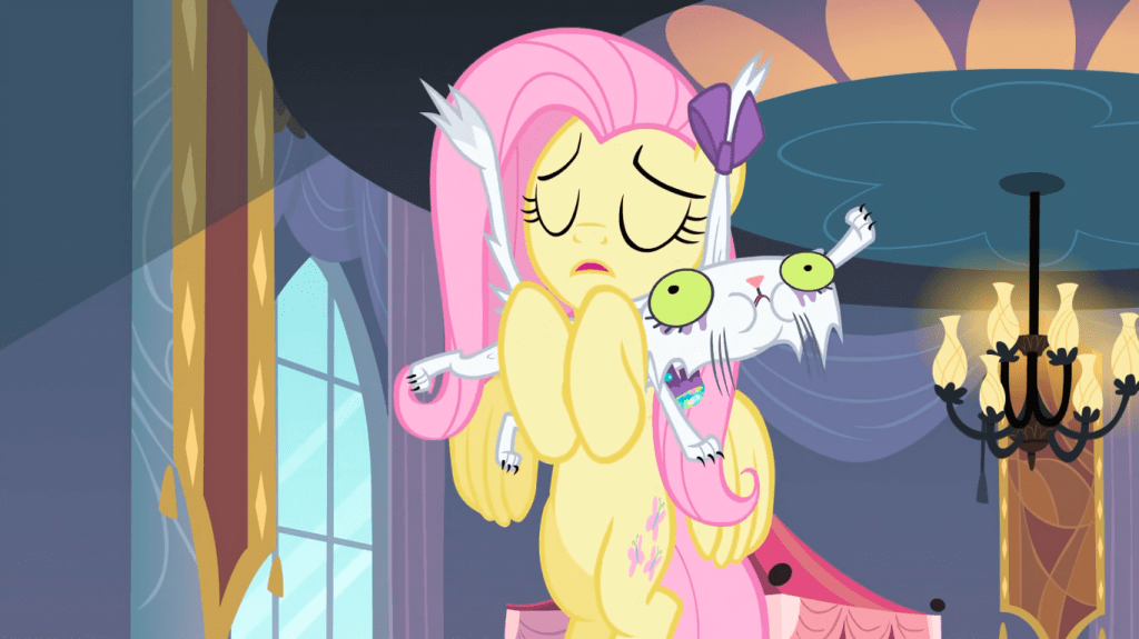 Rarity directs her monologue about pros and cons of attending the Wonderbolts derby (as with all monologues in this episode) at Opalescence while pacing back and forth, which I find endearing. She can’t help talking to herself, and she knows that many consider it weird, so she decides it’s less weird if she monologues to her cat. Not many other characters have monologues at their pets. Pinkie Pie does it with Gummy sometimes, but she’s, well… Pinkie Pie. And Fluttershy doesn’t monologue at her animals, but rather has proper conversations with them.