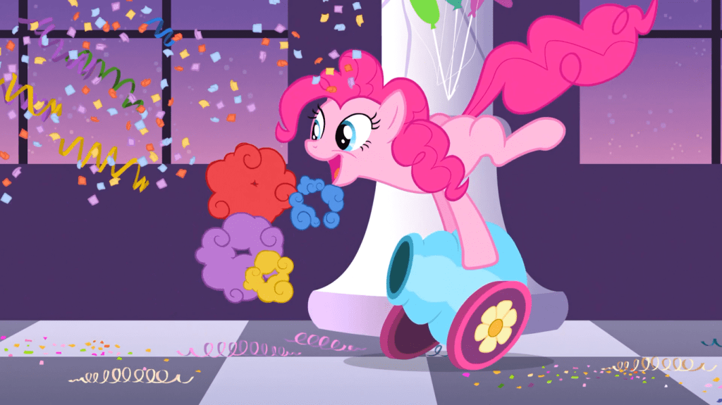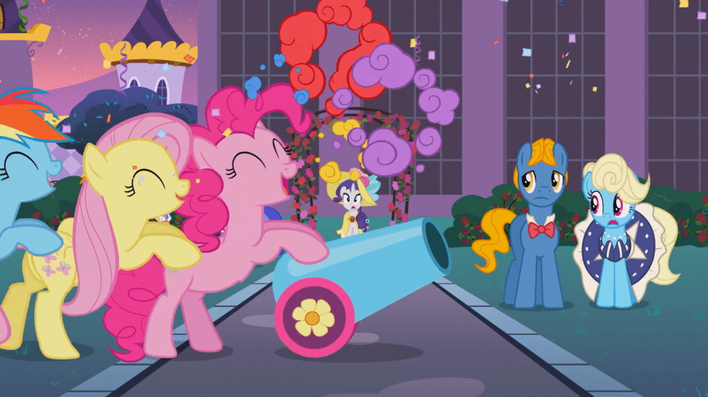 As Rarity’s friends reveal that Celestia has kindly allowed them to host Twilight Sparkle’s birthday in the Canterlot castle, Pinkie Pie presents the debut of her party cannon, which she reportedly never leaves home without. I can’t explain why, but I really, really love that the party cannon is a thing that exists.