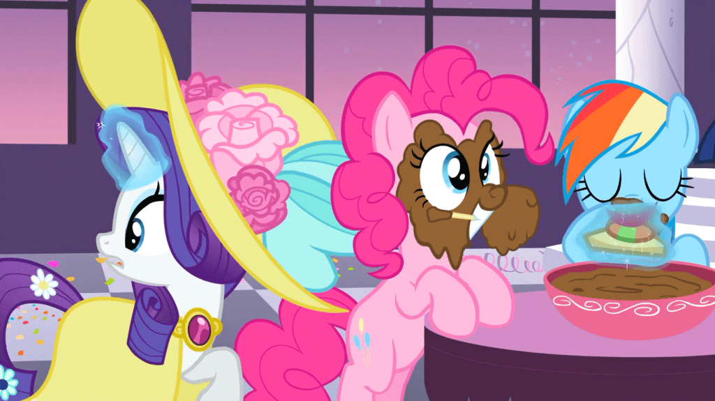 Rarity is provided some stereotypically miniscule “fancy food” at the garden party, and then she does something with the food that’s extremely Rarity. She secretly dips the food in chocolate, hoping that will make it taste better while still meaning that she has eaten it. And after she eats the chocolate-dipped fancy food, she spits it out anyway, perhaps because the flavors so strongly clash. I imagine that Pinkie Pie would gladly dip the food in chocolate and swallow it in one gulp; Applejack would taste it and admit it tastes like garbage, then talk about how her food at Sweet Apple Acres is so much better; Rainbow Dash would grab the food and secretly throw it away; and the others would eat the food and pretend they like it. Only Rarity would make an honest attempt to eat the food while the garden party’s guests can’t see her.
