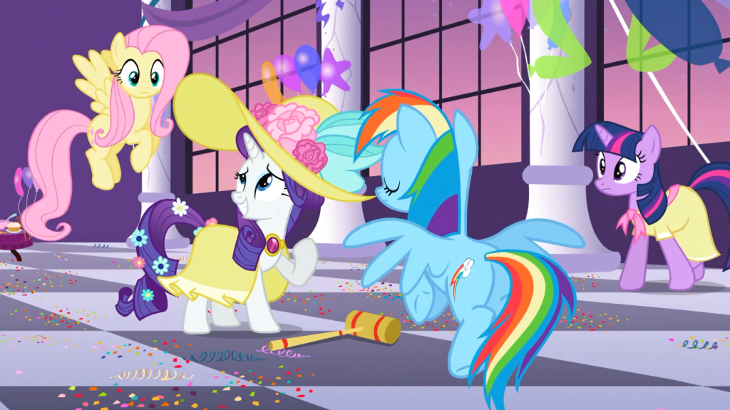 Rarity’s cover is blown when her friends notice a croquet mallet in her mouth, but her friends turn out to be OK with the revelation that she was in two parties at once, and even impressed that she switched between the two so quickly—noticing a pattern here? This episode is all about Rarity hiding truths that she had no reason to hide, and her friends and new acquaintances forgiving her easily. The viewer is consistently immersed in Rarity’s mindset and is convinced that she needs to keep up those lies and excuses to maintain her reputation in Canterlot, but it turns out there was no need to hide anything!