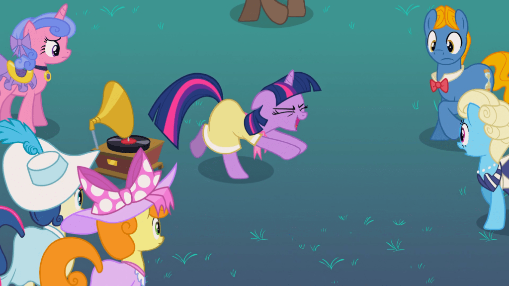 … her exuberant dancing (under an expansive definition of “dancing”) is so hilarious, it transcends words. All the guests from Canterlot back away in fear as Twilight Sparkle dances to her heart’s content, and she even sticks out her tongue briefly. Her normally collected nerd self has been washed away, and she’s gone unhinged.