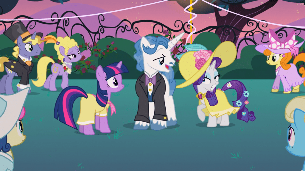 Fancy Pants notices Twilight Sparkle’s dress and asks her who made it. After she says it was a good friend of hers from Ponyville, Rarity tries in vain to distract the guests, but Twilight Sparkle then blurts it out. Rarity first walks away in embarrassment, but then gives a speech about how all these ponies who crashed the party with their unsophisticated mannerisms are her very best friends. Fancy Pants responds with a surprisingly open-minded remark: