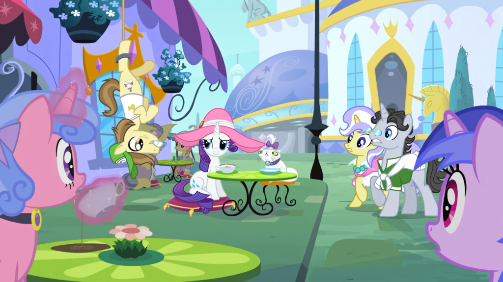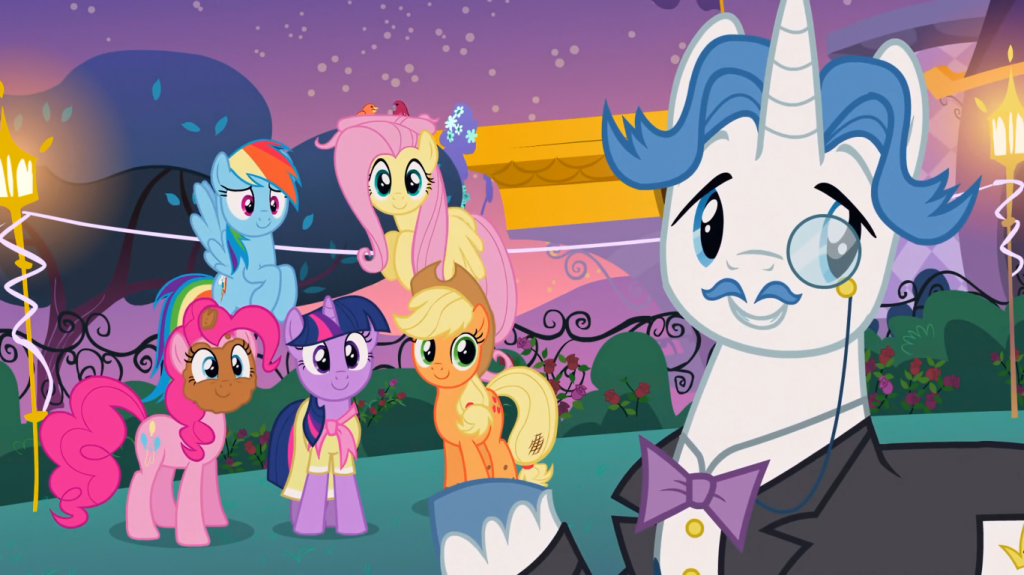 There we have it: Fancy Pants is basically a make-up for Rarity’s time spent with the aggravating Prince Blueblood. Though she hasn’t found a new love interest, she’s made a new friend who’s open to learning about all her other friends and is refreshingly decent and respectful to her. Fancy Pants easily sways the guests’ opinion with the last line quoted above, which says something about… popular people swaying opinions, I suppose. He then offers Rarity to introduce him to her friends, which we can presume she does offscreen. You can easily imagine Pinkie Pie saying something goofy upon being introduced, or Fluttershy saying hi in a meek and gentle manner.