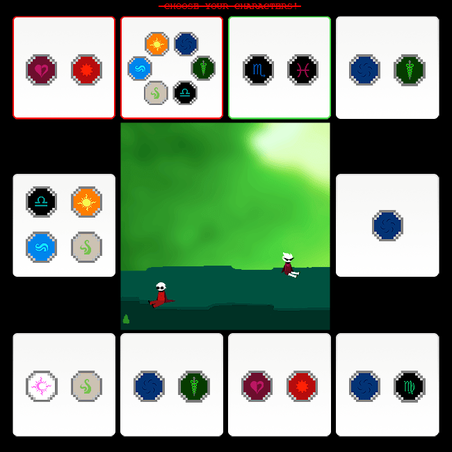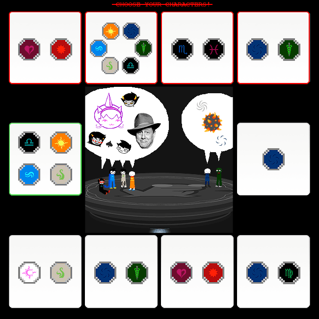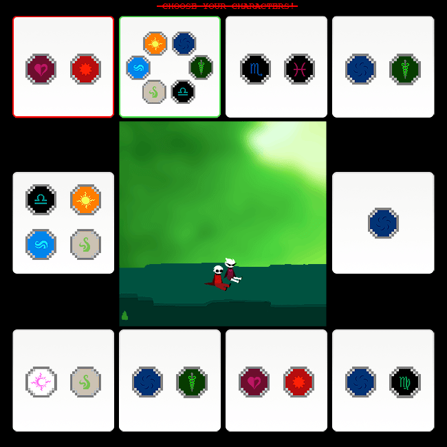 Although this passage initially makes the fake select screen seem like a brutal prank, we’re instead going to be treated to a fun spin on character select screens: instead of going through options in whatever order you want, you go through them linearly, and after each option, you can hover over all the prior options to check on each group of characters. So this fake select screen isn’t completely fake: it’s more of a twist on select screens that focuses more on the rollover aspect.