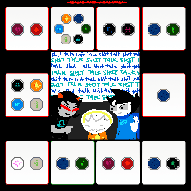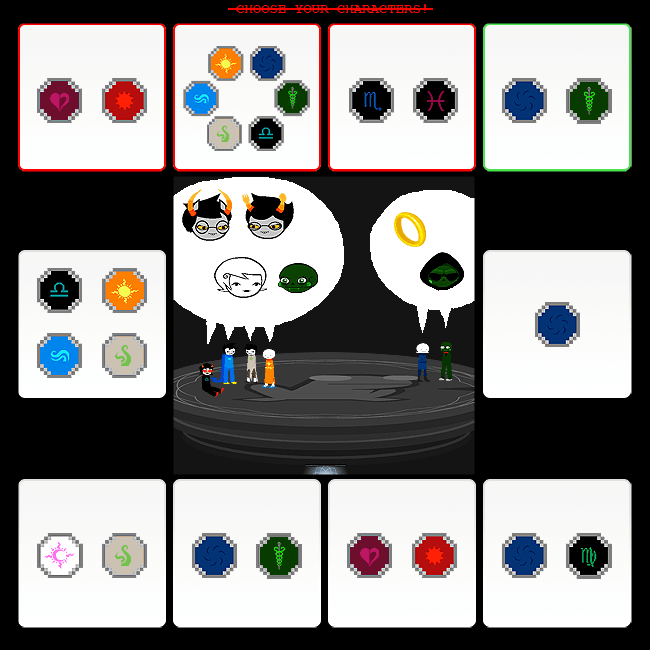 Given the contents of the select screen shown above, it makes sense for it to be in linear order as I just described. Roxy/Calliope and Dave/Dirk both show up twice in the list, and there’s a lot of bias towards Roxy in there. Most of the conversations feature characters presently on the victory platform: the only ones that don’t are the two Dave/Dirk sections and Meenah/Vriska. Note that I will not be going through the entire fake select screen in this post: rather just the first eight options. I will go through the ninth (Dave/Dirk) in the next post, and the tenth (Roxy/Kanaya) up to the true final select screen in the post after that. After that is three more posts going through the rest of A6A6I5, the Collide post, and the Act 7 and credits post.