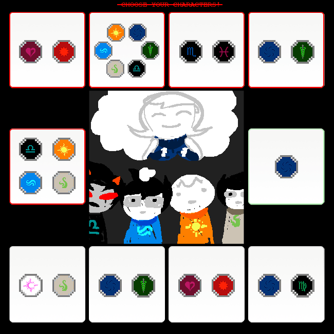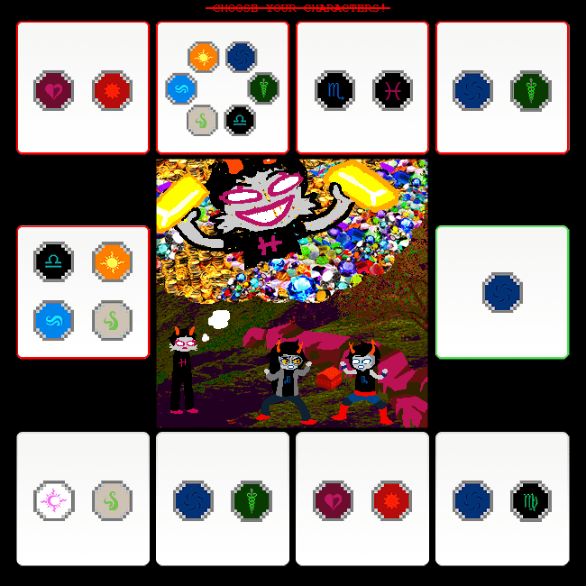Two scenes left! Well, at least for this post. Both of those scenes are short with little dialogue, so we’re almost done with this post. In the fake select screen, the only scene I have something to say about this time is Meenah’s fantasy, which is yet again reminiscent of the Condesce. Both on Alternia and post-scratch Earth, the Condesce liked having juggalo subordinates, and the only juggalo who Meenah knows is Kurloz, so that’s why two copies of him are carrying her in her current fantasy. The pair of clowns carrying Meenah parallels the pair of clowns who spent a decade or so destroying the United States.
