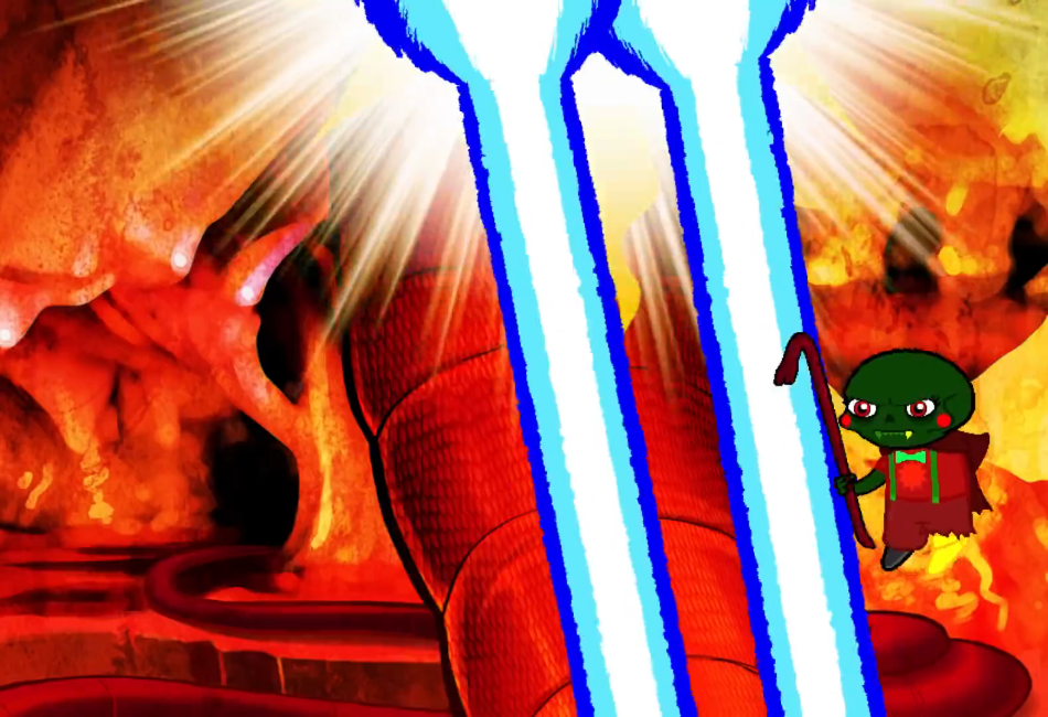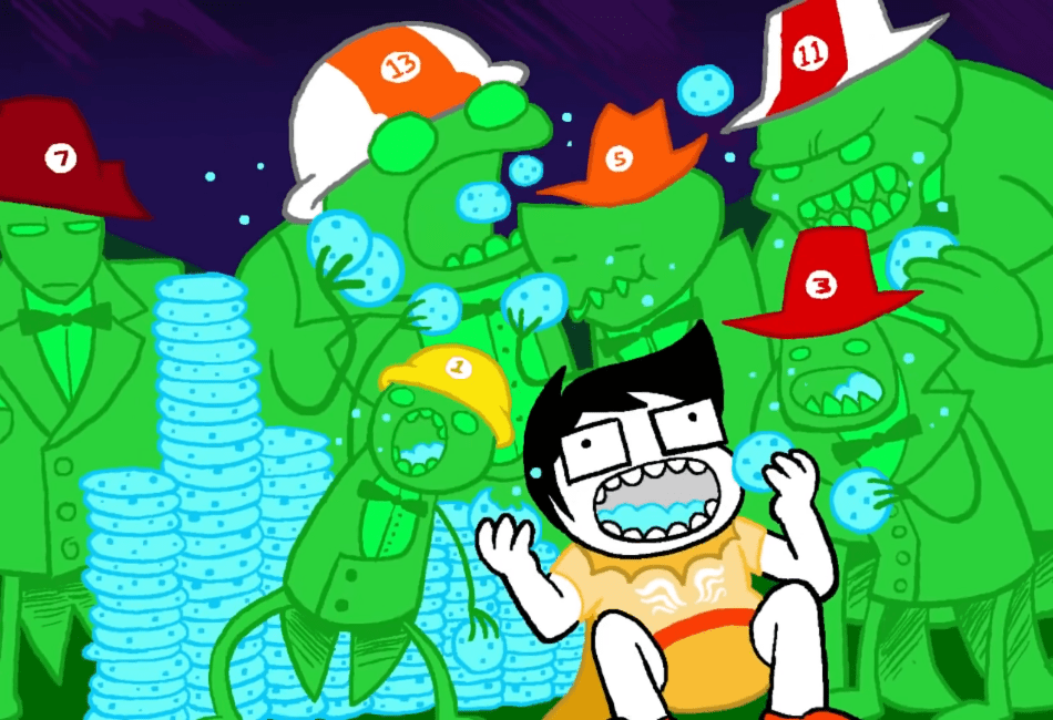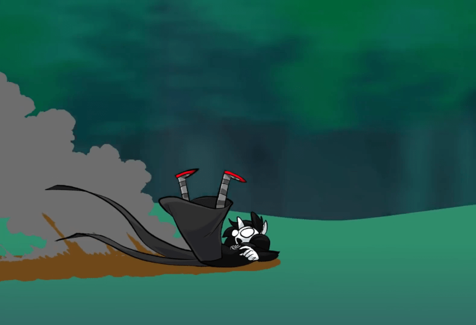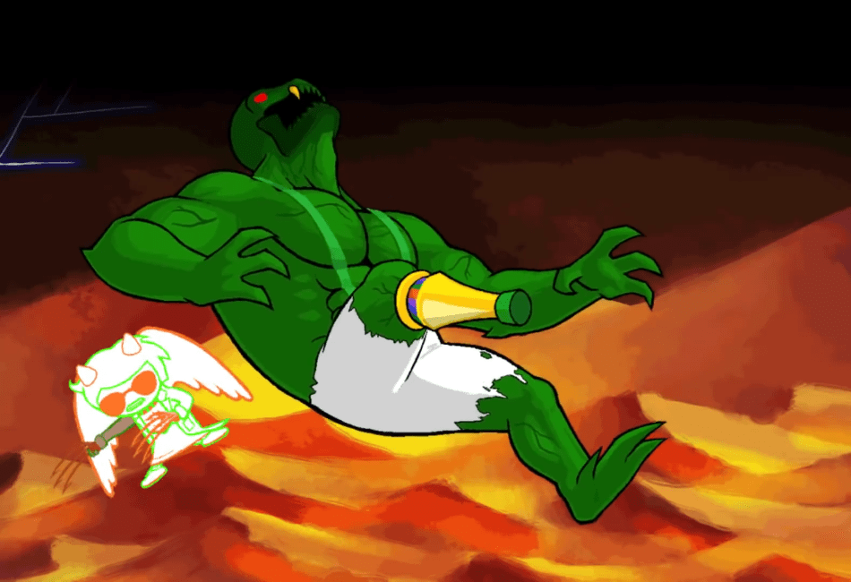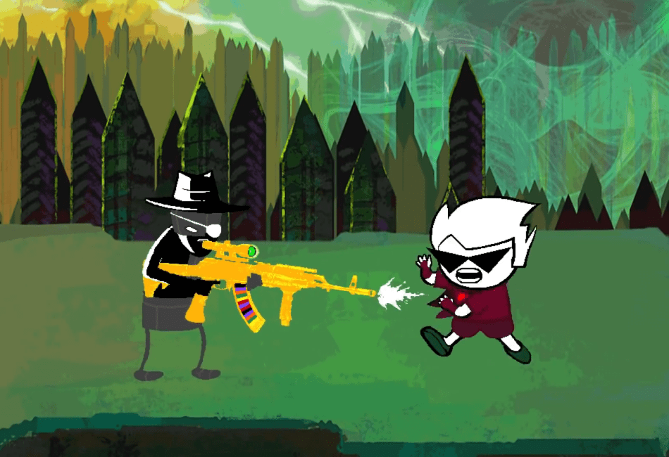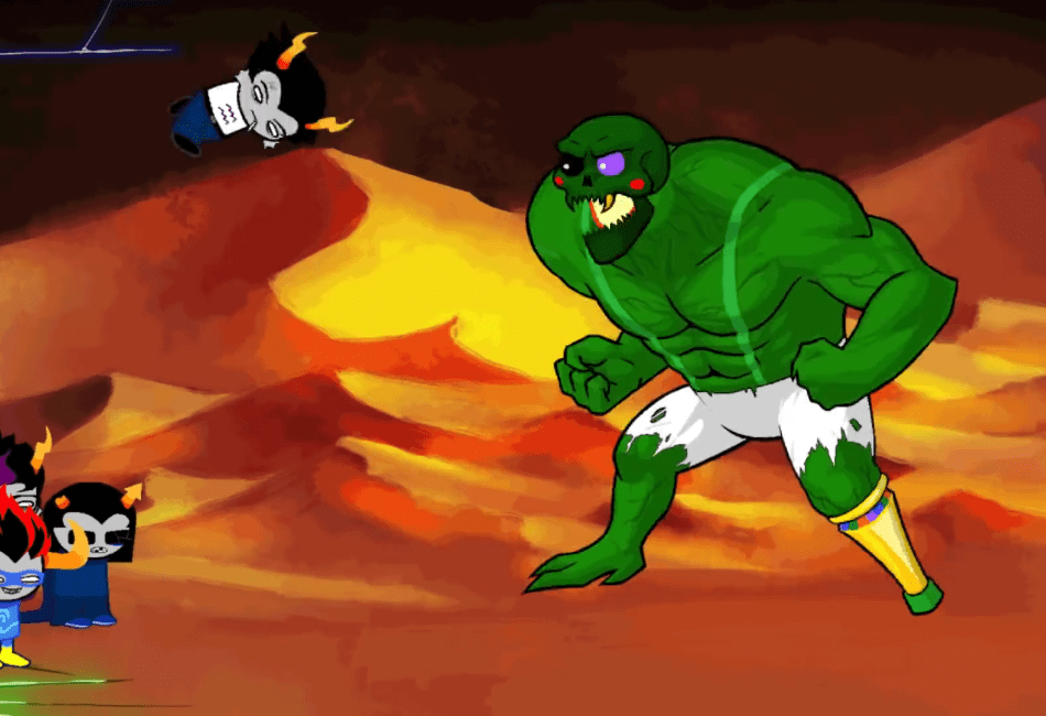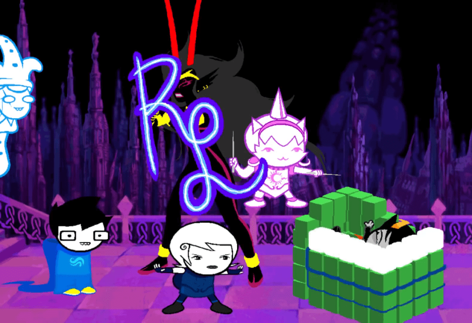 Yep, that’s right: [S] Collide has a scene paying homage to Undertale, which makes a lot of sense to include in Homestuck. During the Omegapause, Toby Fox released Undertale in full, and the game absolutely EXPLODED in popularity, enormously eclipsing Homestuck. I shouldn’t have to tell you that if it weren’t for Homestuck, Undertale probably wouldn’t exist, so this scene is basically the payback for one of Homestuck’s musicians making such an acclaimed game. It’s a fun little animation that may feel out of place to some, but I feel like it was an obligation for Homestuck to pay homage to Undertale before it ended. Homestuck has always been intricately built upon references to other media.