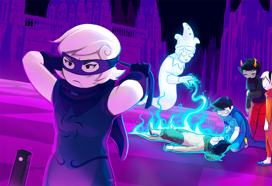 Really, can you blame Spades Slick for being frustrated with these kids? He doesn’t know who the humans are, and he probably doesn’t even remember any of the trolls except maybe Karkat. As is characteristic of any version of Jack Noir, if someone he doesn’t know about gets in the way of his goals, he won’t hesitate to shoot them down. His fate in Collide is a tragic outcome of his typical Jack Noir ways.