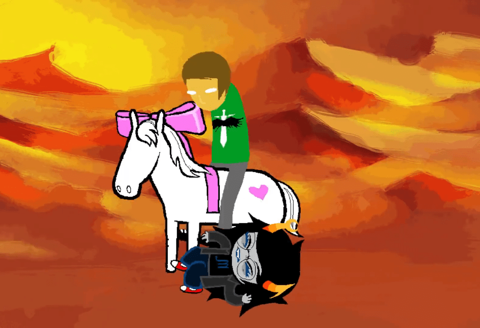 After being beaten up by Vriska, Hussie points out one last instance of the “ironic proximity to horses” running gag, prompting a thumbs down. You’d think Lord English would have learned about the dangers of horses by now, huh?