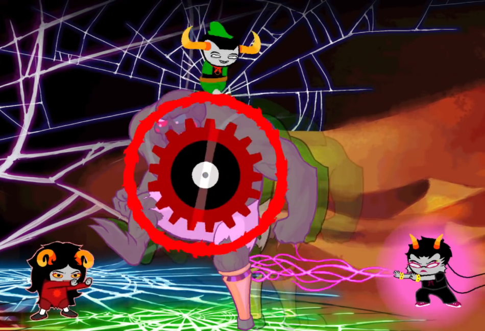 I find it hilarious that Vriska’s only role in Collide is a brief scene where she gets into an incredibly silly fight with Hussie’s self-insert, complete with the return of Maplehoof. She’s left out of all the glorious action in Collide, but Act 7 is a way different story.