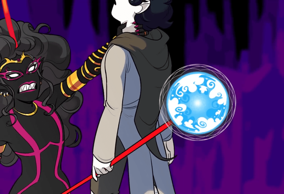 … to the alpha kids’ Skaian scepter, held by Jane as the Condesce chokes her. To this day, I’m not sure what the narrative purpose of the Condesce choking Jane is since Jane’s relationship with the Condesce has been barely discussed in so long and it’s so quickly averted, other than maybe giving the other kids a new boost of rage, ready to bring it on and finally defeat the witch? In any case, it’s clear the the Condesce is furious at her heiress and is expressing this fury one last time before she meets her demise.