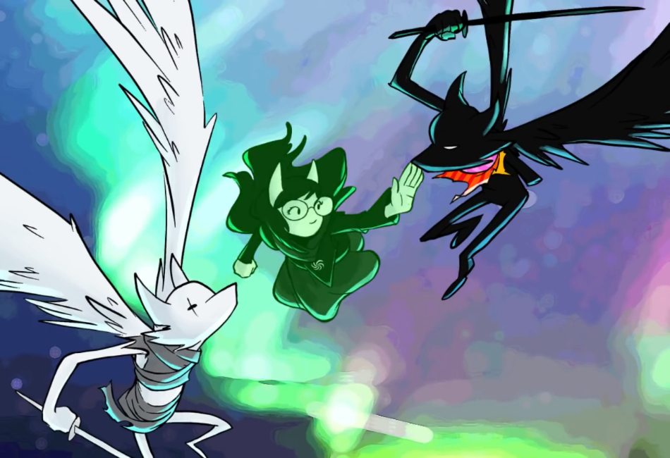 In the fight against the Condesce, John, Rose, and Roxy demonstrate excellent use of their god tier powers. Kanaya does too with her chainsaw to an extent, but she also spends portions of the fight spacing out reading books or doing her makeup, like shown above. This leads to a common criticism that Kanaya didn’t do all that much in this fight compared to the other three players, which is sort of a fair criticism, but it’s also weird to criticize based on funny background events.