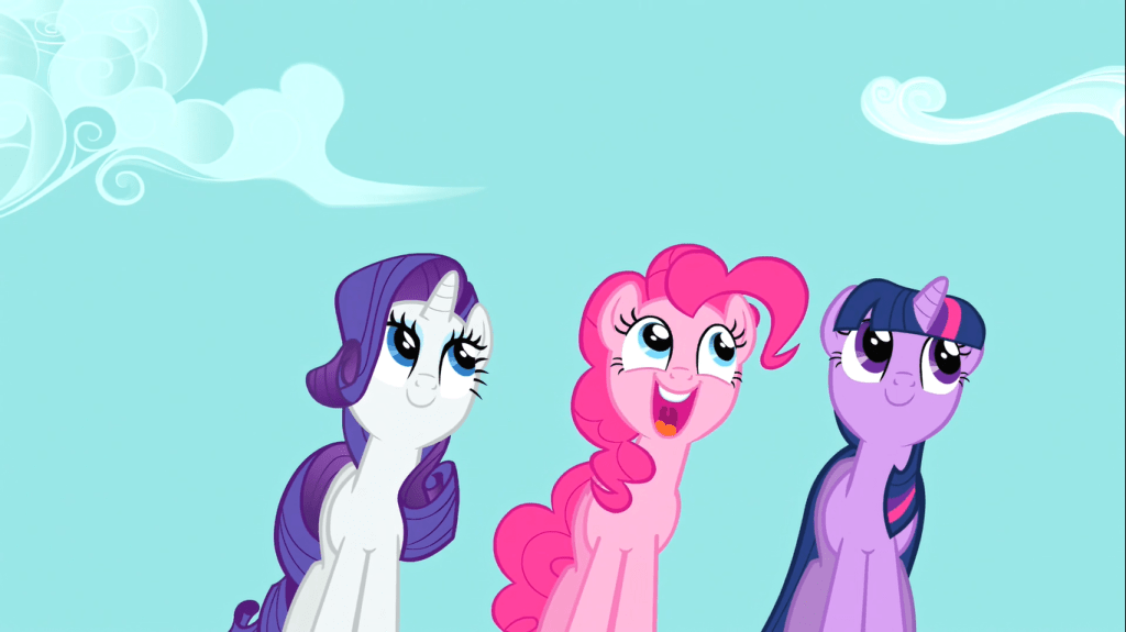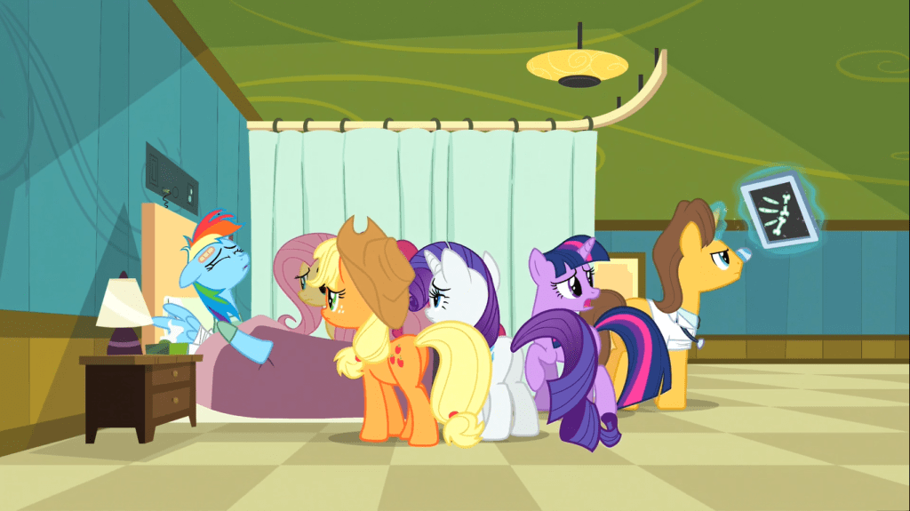 Imagine what it’s like watching this episode for the first time, unaware of what it’s about. Twilight Sparkle, Pinkie Pie, and Rarity watch Rainbow Dash perform stunts in the sky, until she gets out of control and injures herself. We don’t see the injury, but rather hear sound effects and reactions from the ponies shown above, loosely indicating that it’s not something good. This cleverly leads up to the dire circumstances that cause Rainbow Dash to become the in-universe equivalent of a brony.