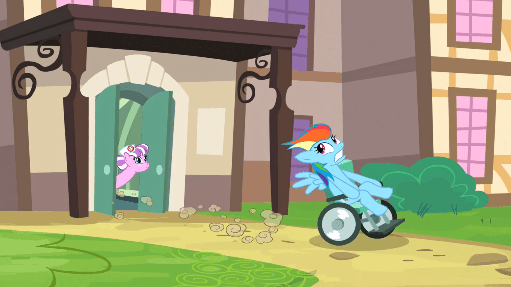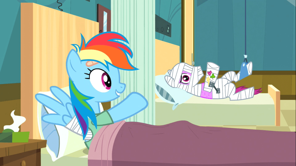 Rainbow Dash is so hasty to get out of the hospital that she forgets her wings are hurt and briefly lives up to her derogatory nickname, Rainbow Crash. She’s trying to do a cool narrow escape à la Daring Do, but she’s clumsy enough that she comes off as a desperate buffoon instead.