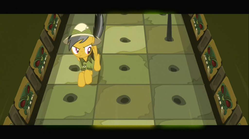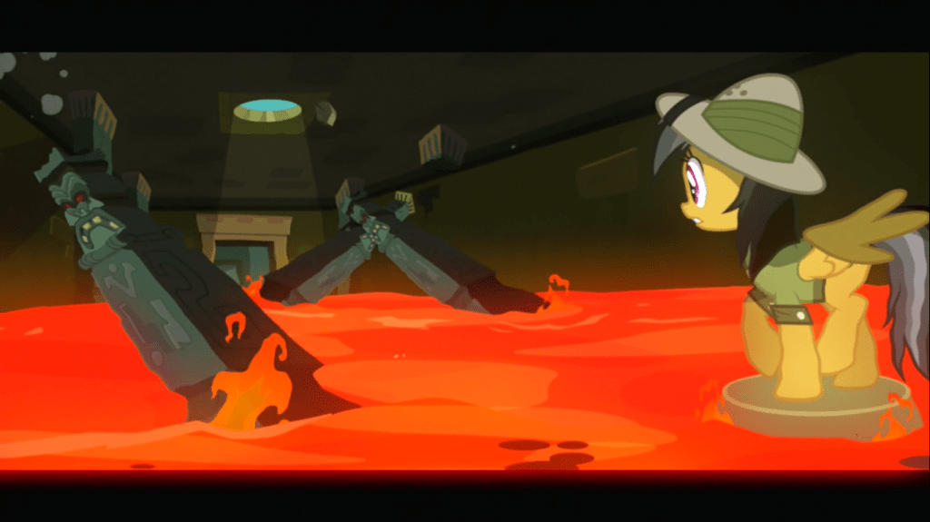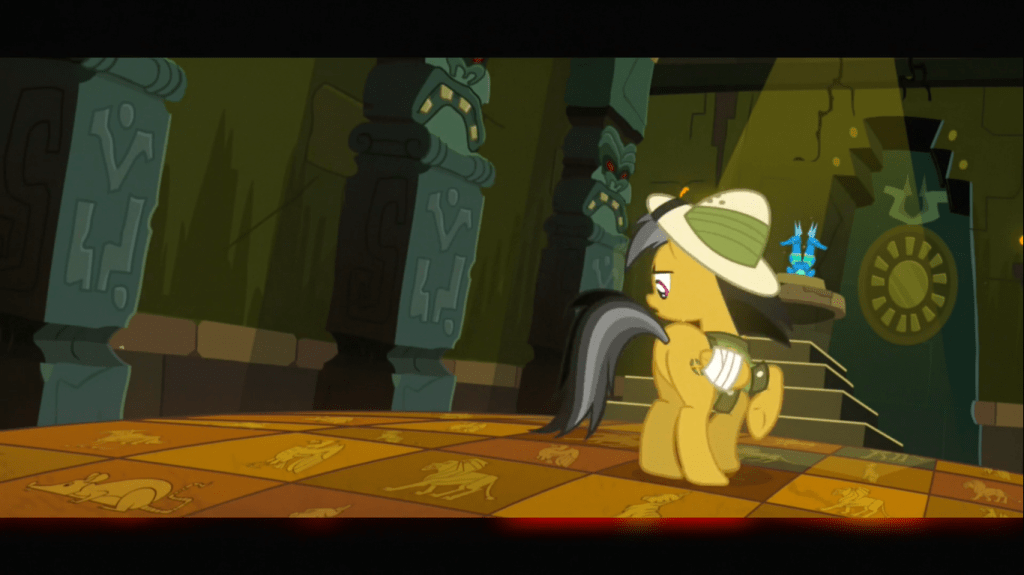 The story’s action continues with a thrilling and well-animated scene where Daring Do narrowly makes it through the temple’s insane gauntlet of hazards. The show’s never had intensive action quite like this before, and future episodes involving Daring Do will continue to deliver with these action scenes paying homage to Indiana Jones. Right as Daring Do makes her way to the sacred artifact, Rainbow Dash is forced back into reality as two friends greet her.