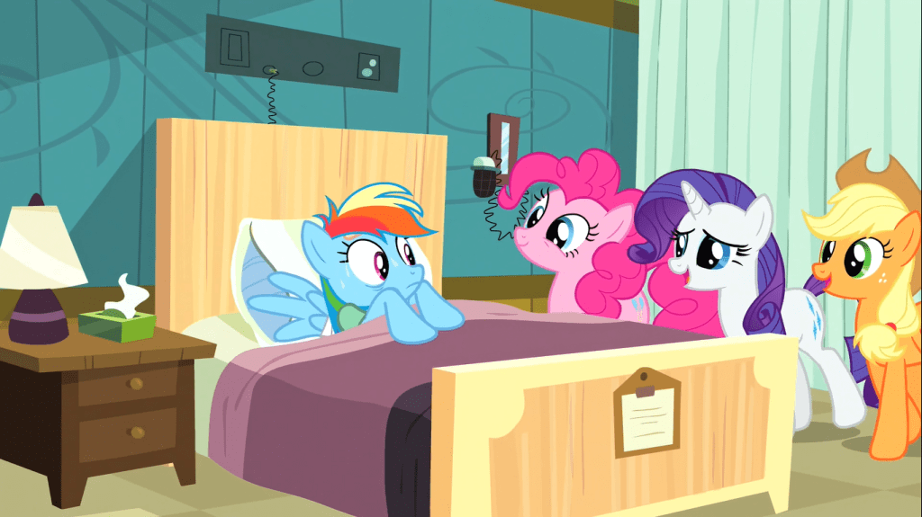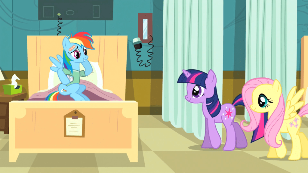 Rainbow Dash’s friends try to assure her that the hospital will be a reasonably pleasant place and not the dreary confinement she thinks it will be. While hospitals do tend to be designed with a comforting and welcoming atmosphere, this doesn’t make it any less of a prison for poor Rainbow Dash.